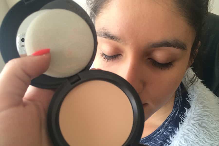 Luego aplicamos cualquier tipo de polvo que tengan, sea traslúcido, de su tono de piel, compacto o sueltos y sellaremos nuestra base. Debemos preocuparnos de que quede todo parejo.