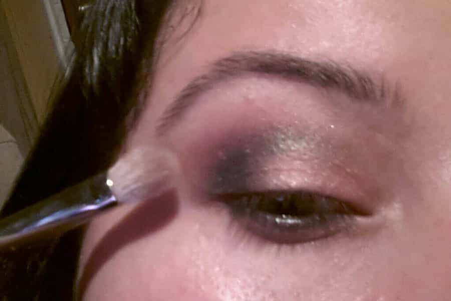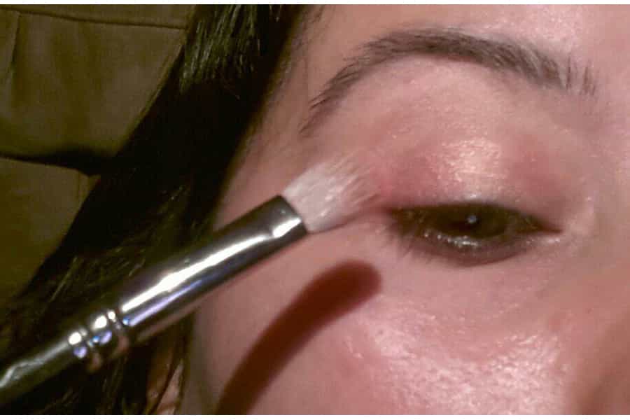 La sombra oscura, la aplicarás en el ángulo externo del ojo, con movimientos circulares hacia dentro del pliegue, siempre con movimientos circulares pequeños, y luego círculos más grandes hacia la orilla y arriba de la ceja, para esfumar el ahumado.