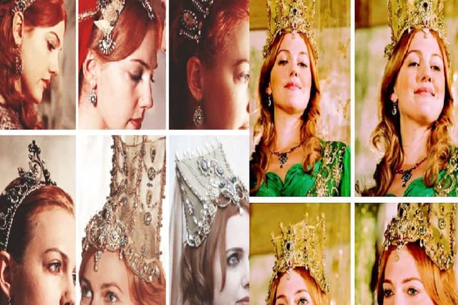 Siempre he tenido la duda existencial de cómo las reinas (ya sean Misses o las de verdad) pueden llevar semejantes armamentos en la cabeza. Alguna vez me tocó bailar música colombiana y me puse un tocado, pero fueron 5 minutos, no una telenovela completa. En fin, dejándome de divagar, sus diademas y coronas son realmente ¡de otro mundo! Diseños increíbles, adornados con piedras preciosas y bases de oro. Ella debe llamar la atención entre sus pares y ¿cómo no, con semejantes adornos?. Además, su tono pelirrojo vibrante permite lucirlos mucho más: largo, juguetón y con rizos sueltos, pero definidos, son el complemento perfecto para un look excepcional, digno de quien interpreta a una de las mujeres más inolvidables de la historia turca. ¿O no?