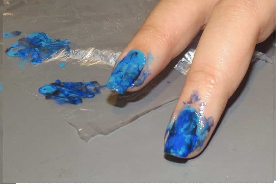 - Pon gotas de otro esmalte en la uña, sin que se sequen posa sobre tu uña un trozo de bolsa de plástico y deja que los colores se mezclen entre sí. Déjalo secar por algunos minutos, es importante que estén muy secas antes de seguir con el siguiente paso. Aplica tu Top Coat favorito.