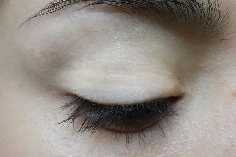 Comienza aplicando una sombra de tono claro (puede ser blanco, beige o nude) sobre el párpado móvil y debajo de la ceja. Procura no aplicar demasiada, pero sí cubrir toda la superficie.