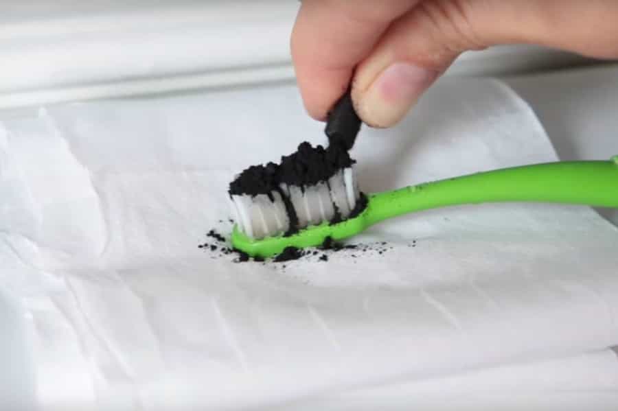 - Ahora, toma tu cepillo de dientes (puede ser el mismo que usas siempre. No queda manchado), humedécelo en el agua y luego úntalo en el polvo de carbón.