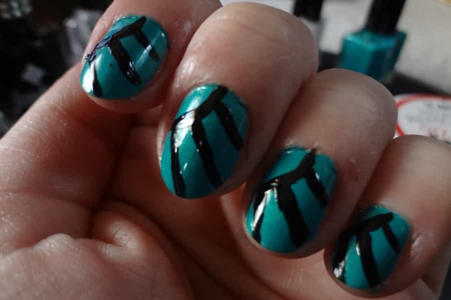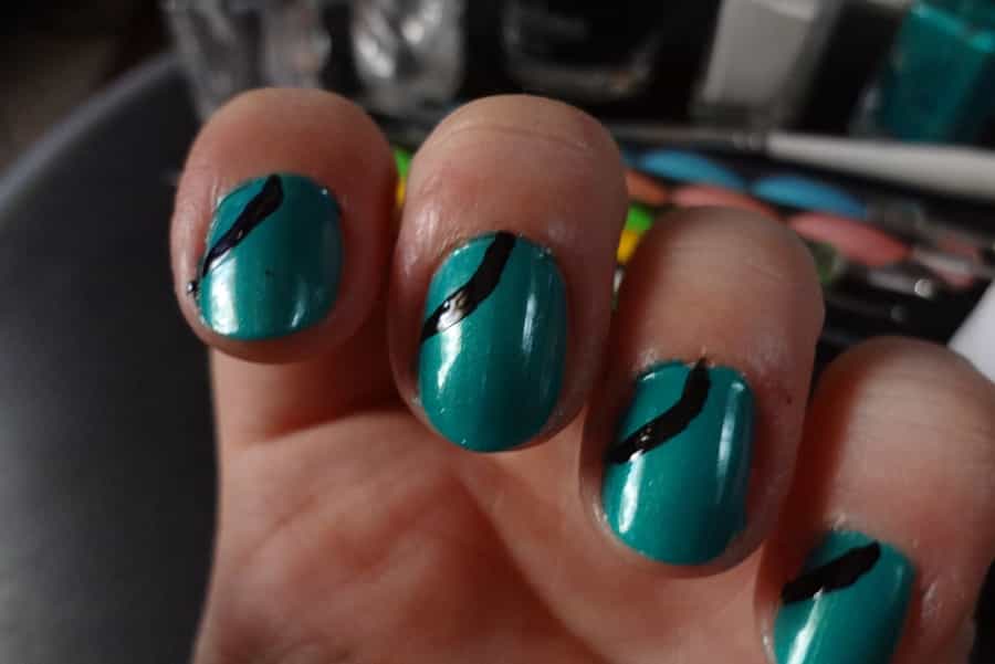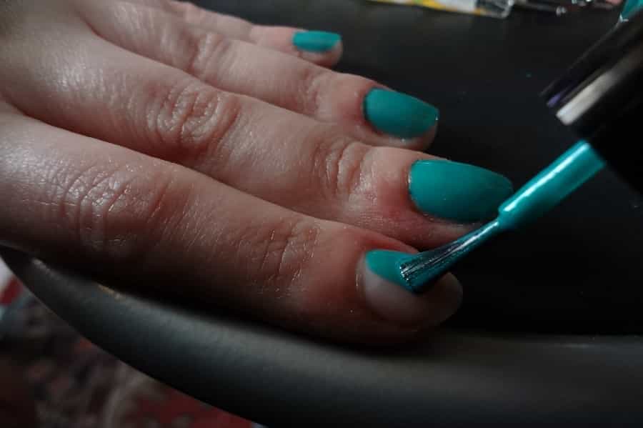 Para empezar, debes pintar todas tus uñas con una o dos capas del esmalte que hayas elegido como base. En mi caso, usé un turquesa levemente metalizado porque quiero un look para usar de día. Si es para la noche, puedes usar un color metalizado o nacarado para que resalte.