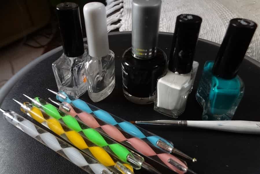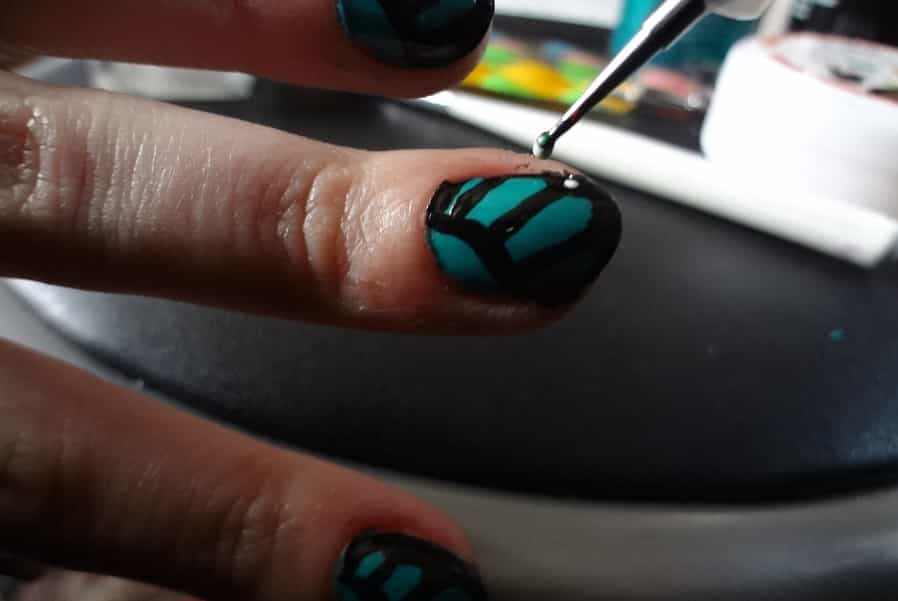 Con un puntero o mondadientes, agrega algunos puntos en la esquina de la uña que está pintada de negro. Una vez que esté completamente seco el esmalte, aplica una capa protectora. Asegúrate de que se seque bien o sino podrías arruinar todo el trabajo que has hecho.