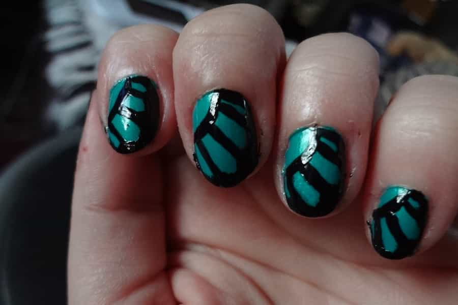 Para comenzar a dar forma a las alas, usa el esmalte negro para pintar el contorno de la uña. Simultáneamente debes ir redondeando cada línea, como dibujando olas, para que quede como las alas de una mariposa.