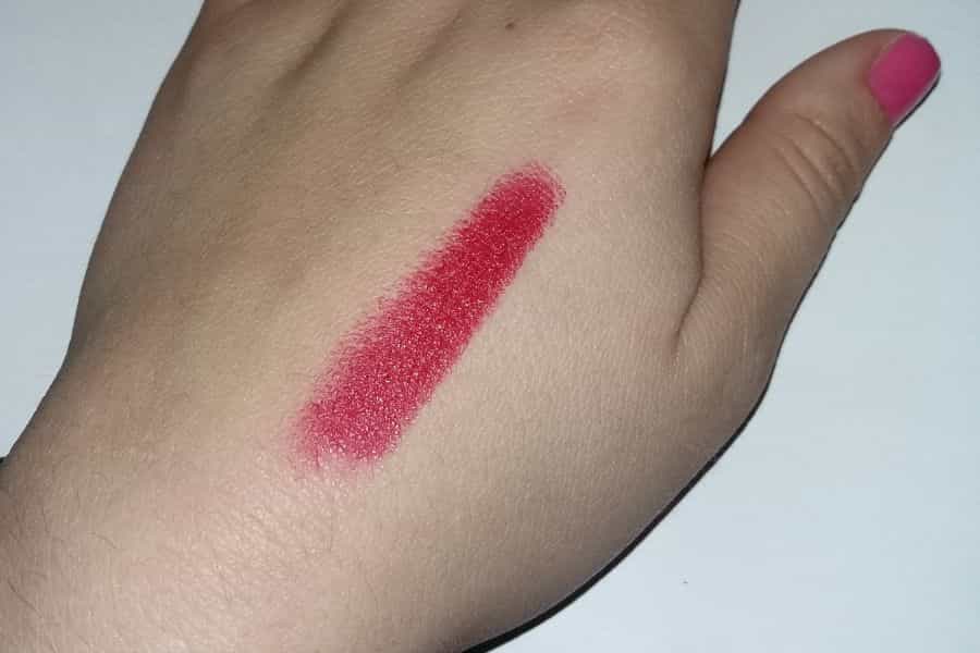 Es un labial completamente matte, es decir, no tiene brillo, y tiene un olor agradable, parecido al de una crema o a los labiales que teníamos cuando pequeñas en nuestro primer cosmetiquero, muy dulce ¡Completamente delicioso! Su textura es suave que lo hace esparcirse bien, puedes apreciar color a la primera aplicación del labial, no es muy cremoso. Lo mejor es que se puede usar tanto de día como de noche, ya que no es un color muy fuerte, a pesar de que lo parece. Ocurre algo curioso con este producto, al aplicarlo en poca cantidad parece fucsia oscuro, pero si se le repasa va tomando el color rojo que se aprecia en la barra ¡Puedes mezclar fácilmente tu look con este maravilloso labial!
