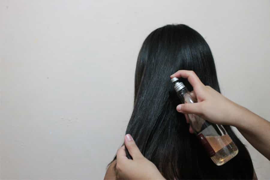 Cuando el producto haya reposado el tiempo suficiente y veamos que tomó una tonalidad amarilla anaranjada, es momento de aplicarlo en tu cabello a modo de enjuague o con un spray. En este caso, vaciamos la mezcla en un rociador de colonia para una mejor distribución del producto. Si quieres maximizar los resultados será necesario que repitas este proceso unas dos o tres veces antes de lavar tu pelo, dejando reposar por alrededor de media hora.