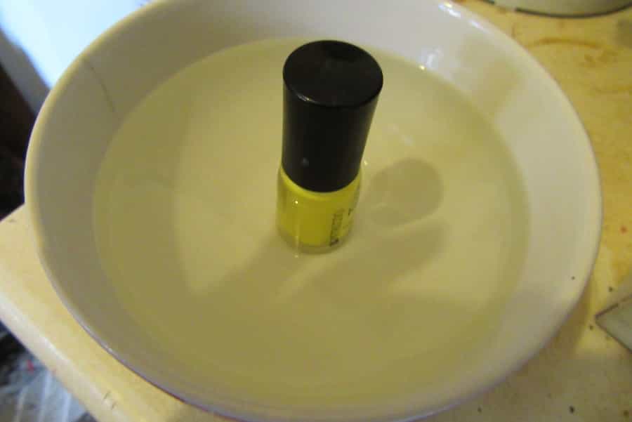 Los pasos son muy simples. Debes calentar el agua en una olla, tetera o hervidor. Una vez caliente, llena el bowl con una cantidad de agua que cubra el envase del esmalte. No es necesario que lo cubra, a menos que la tapa esté pegada y necesites abrirlo. Introduce el esmalte bien cerrado en el agua y déjalo ahí durante unos 10 minutos.
