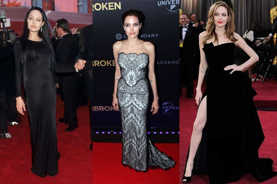 En el año 2000, Angelina Jolie fue considerada una de las peores vestidas de la alfombra roja de los premios Oscar, por lucir un atuendo que parecía sacado de una película de "Los Locos Adams". De hecho, la prensa rosa aún llama a ese look el "Morticia", debido a que la artista lucía una cabellera negra, larga y lisa, acompañada de un vestido largo y oscuro, sin ningún toque de color para equilibrar este look. Sin embargo, ha medida que la artista ha ido creciendo y sus intereses han variado, su estilo para eventos nocturnos se ha vuelto mucho más elegante y distinguido, pero sin perder su sensualidad característica.