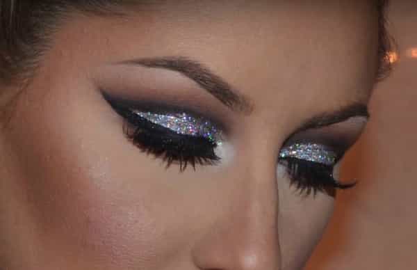 Sombra con brillos: esta hermosa sombra plateada con brillos de colores se ve preciosa, acompañada de un delineado Cat-eye,y unas largas pestañas postizas.