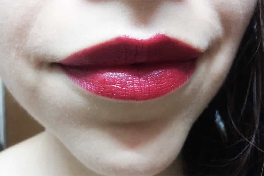 7. Resalta tus labios con un color vino o burdeo (el color de mi labial es más oscuro, pero en la foto se ve un tono más claro). Aplica, si lo deseas, un poco de brillo transparente.