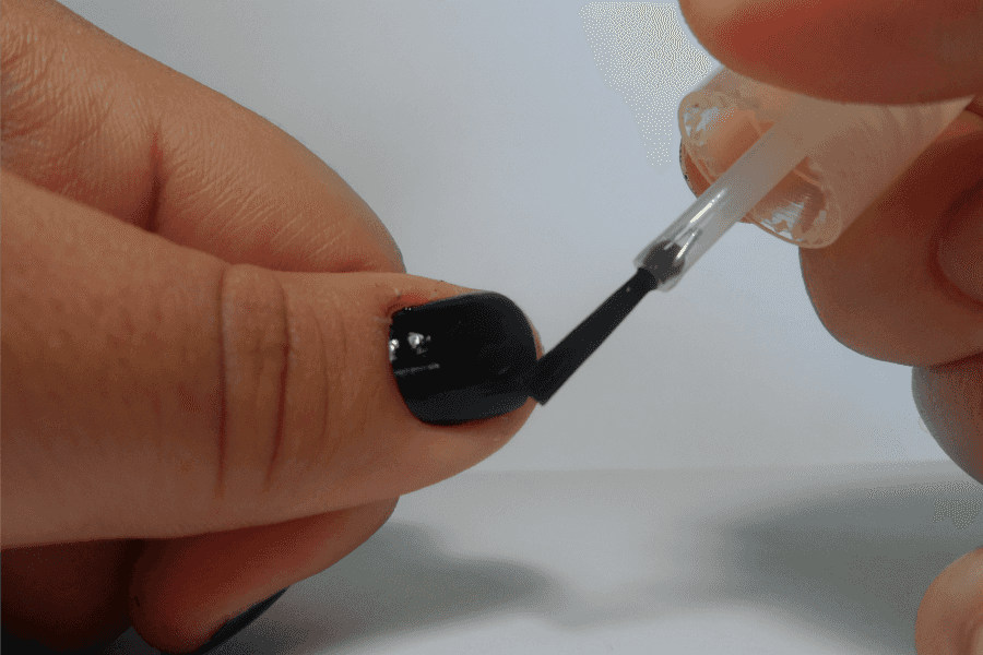 Paso 3. Una vez seco el esmalte negro, aplicaremos en la parte superior de la uña, esmalte transparente, debe ser una linea delgada, emulando la conocida linea blanca de la manicura francesa.