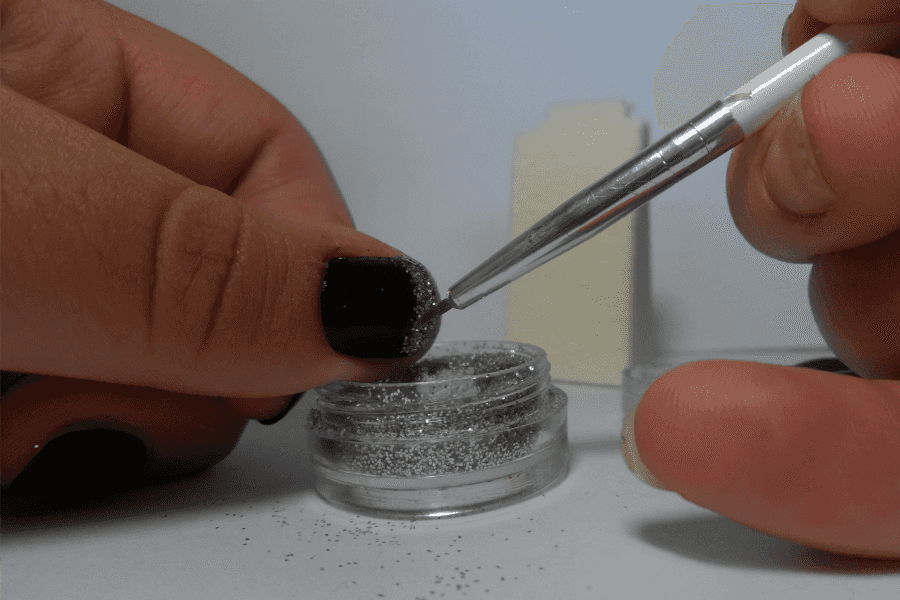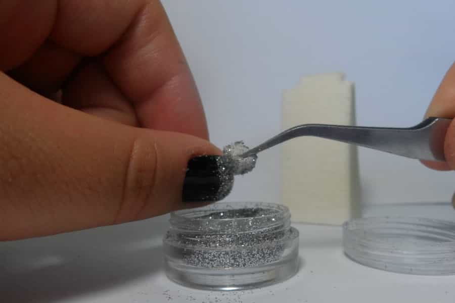 Paso 4. Sin dejar que esta linea de esmalte transparente se seque, arrancaremos un trozo de la cuña de esponja comética y junto a la pinza, se utilizaran aplicar la brillantina sobre la parte superior de la uña.