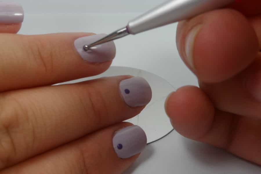 Paso 5. Con ayuda del decorador, tomaremos un poco de esmalte Violet in y lo pondremos en la base de nuestras uñas, al centro de las mismas.