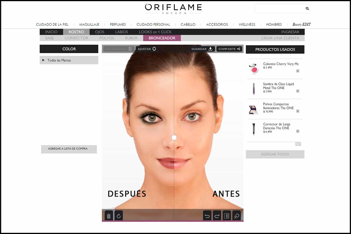 1. Makeup studio: en este centro online de la compañía Oriflame, encontrarás opciones para maquillar rostro, ojos y labios, mediante variadas paletas de colores.