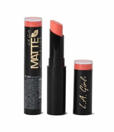 L.A. Girl Matte Flat Velvet en Sunset Chic (Se ve más bien rosado, pero es un coral naranjoso muy bonito, y lo bueno de estos labiales es que tienes dos opciones en un solo producto: puedes optar por la versión mate, o si quieres brillo, aplicarte del gloss del mismo tono que trae la tapa)