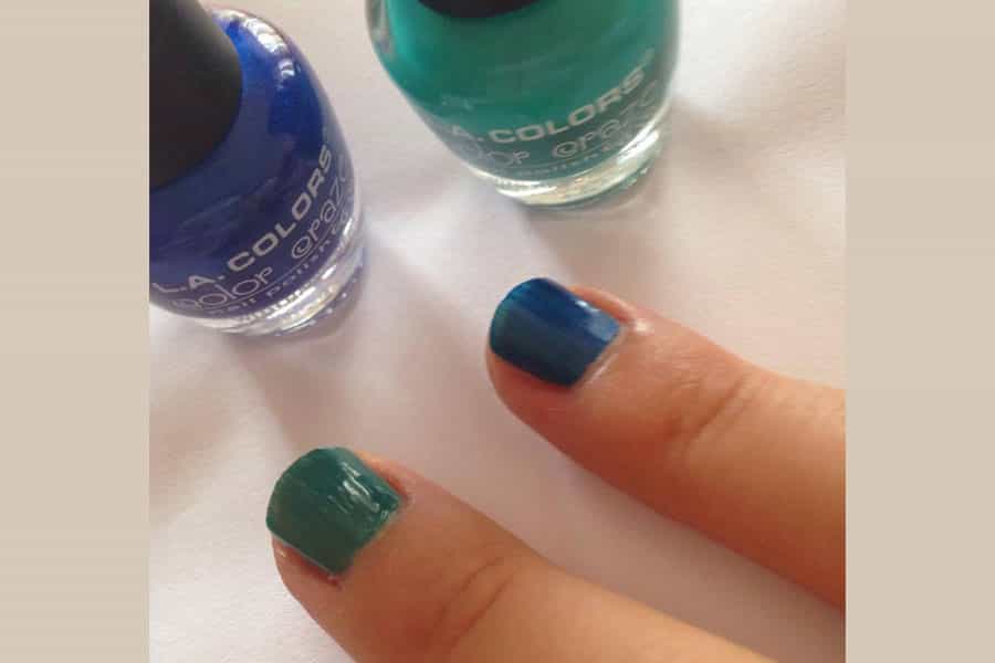 ¡Pero bendito sean los mini esmalte azul y verde turquesa! Al ser más oscuros no quedaban tan transparentes. El azul puede quedar listo en una capa. Mientras que el verde turquesa se ve estupendo tras aplicar dos capas.