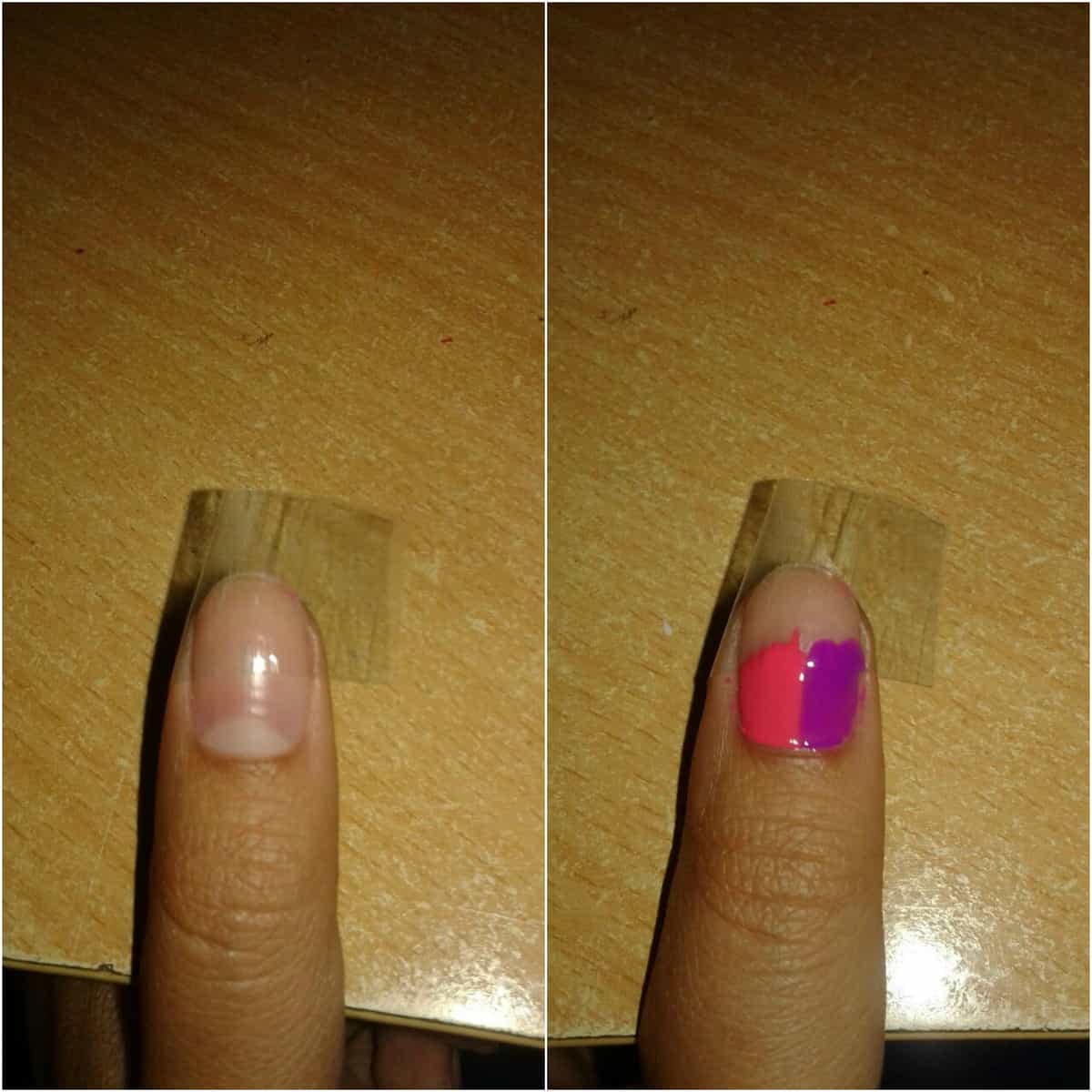Pone cinta adhesiva en la mitad de tu uña. Luego, pinta la mitad de tu uña con un color y la otra mitad con otro. Trata de no aplicar tanto esmalte para que al sacar la cinta adhesiva el esmalte no se corra.