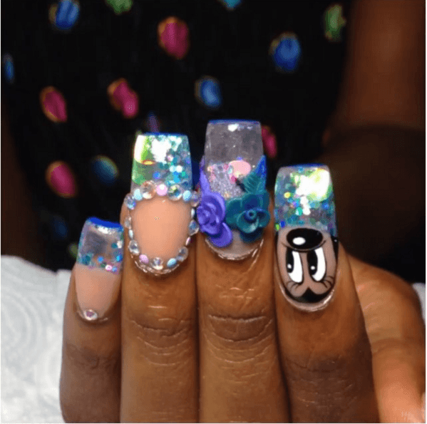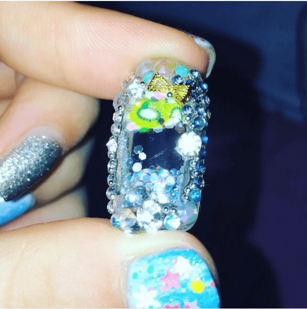 Se trata de un estilo de uñas acrílicas largas, que busca imitar el efecto que tiene un globo de nieve, generando movimiento con un líquido, que puede ser agua o algún tipo de aceite, con muchos brillos y otros múltiples adornos que se te ocurran.