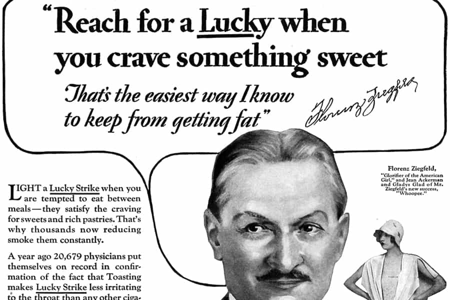 La dieta del cigarrillo: la verdad es que, aunque pocos lo entiendan ahora, fumar no era tan mal visto unos años atrás. De hecho, muchos doctores fumaban y dejaban fumar dentro de la consulta médica. EverydayHealth nos cuenta que hacia 1920, las empresas tabacaleras promocionaban los cigarrillos por sus cualidades adelgazantes. El slogan iba algo como “Para una figura esbelta, fuma en vez de comerte un dulce”. Ok , le reconocemos que el quitarse el dulce puede traer algún beneficio pero, cambiarlo por un cigarro, no creo que te haga mucho bien.