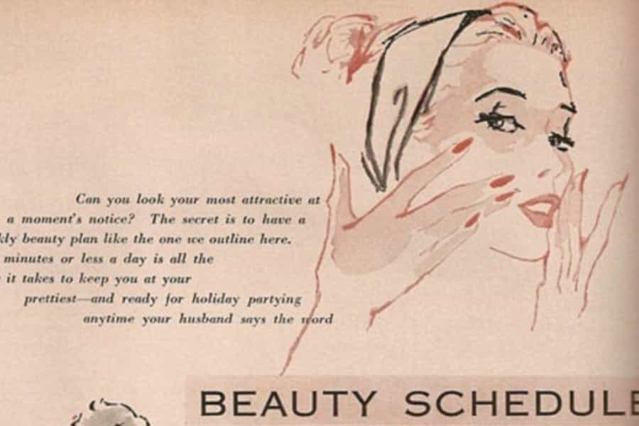 La "Beauty Schedule for Busy Young Wives" fue escrita por la editora de belleza, Mariechen Wilder Smith, en 1952, específicamente para aquellas mujeres que llevaban una ajetreada vida de esposas. Su traducción al español es "Agenda de belleza para esposas jóvenes ocupadas" y buscaba ayudar a las féminas a verse bien en todo momento. El consejo principal era dedicar 30 minutos diarios, cada día de la semana, a cultivar una zona específica del cuerpo.
