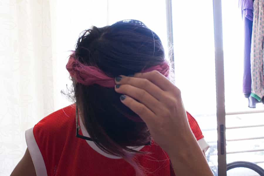 Tengo el pelo bastante largo, con mucho volumen y textura, lo cual en este caso funciona un poco a mi favor. Si tu situación es diferente, te sugiero agregar algo de volumen a tu pelo usando un fijador. Lo primero que deberás hacer antes de salir es echar bastante fijador con la cabeza hacia abajo.