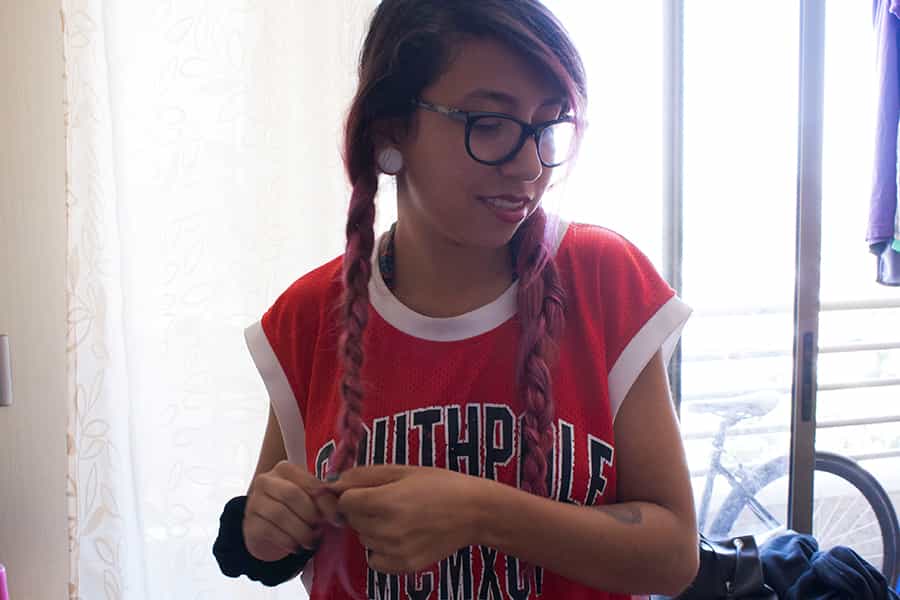 Para esta trenza lo que debes hacer es dividir tu cabello en dos, trenzar hasta las puntas y luego cruzarlas una por encima de la otra para asegurarlas en el tope de la cabeza con un gancho. Este peinado lo uso mucho por sí solo, ya que es súper lindo y fresco, además de fácil de hacer, pero cualquier otra trenza cumplirá la misma función: proteger tu cabello y evitar que mueras de calor bajo el casco.
