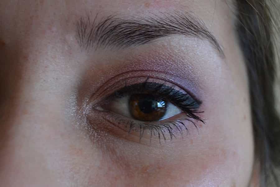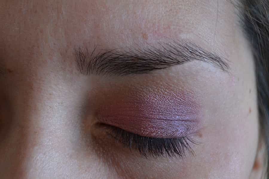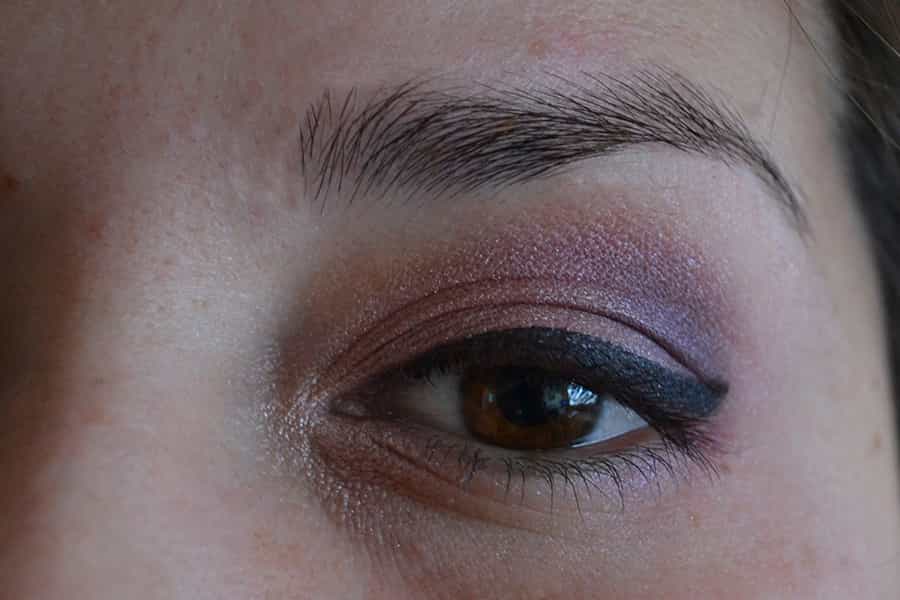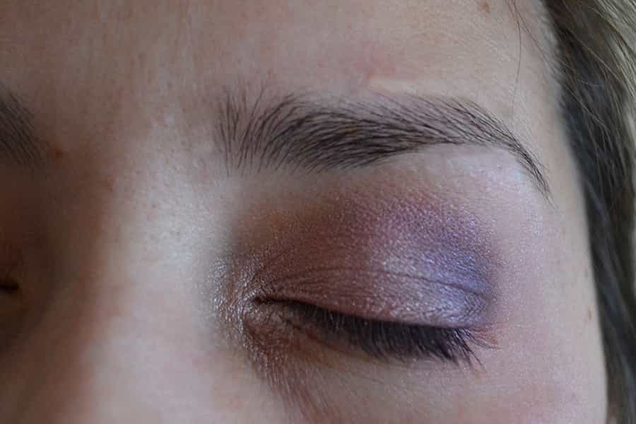 Posteriormente, tomamos un tono morado claro y lo añadimos desde la mitad del párpado hacia la cuenca del ojo, difuminando bien.