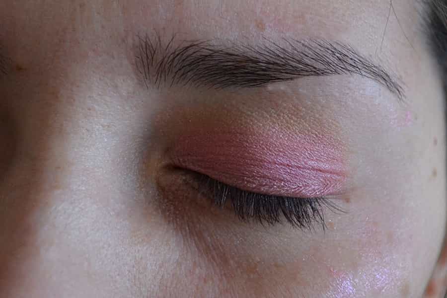 Lo primero que haremos es utilizar una base de sombras que sea lo más parecida al color del párpado o que tenga tonos rosados. En este caso, yo utilicé Provoke, de Sigma (cuesta 13 dólares y pueden comprarla online). Luego, ponemos un tono rosado en todo el párpado, desde el lagrimal hasta la cuenca.